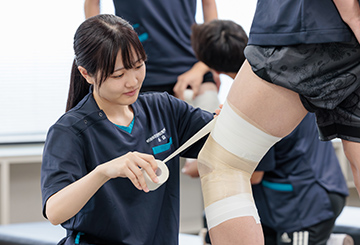 例えば、テーピングを巻く場合。現場では、患者さんの体型や生活習慣、癖などを考慮した上でアレンジする必要が出てきます。その判断や技術こそ、臨床力といわれるもの。本校では資格取得の知識だけでなく、多種多様な実習経験により、柔軟に対応できる臨床技能を養います。