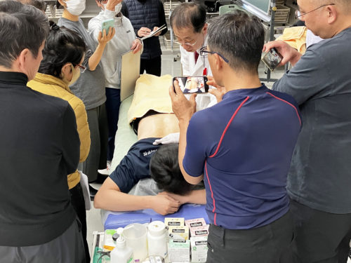 この専門臨床研修会では、毎テーマ事前学習として受講いただく皆様に講義動画を配信させていただいており、あらかじめ予習をして、当日の研修会に参加いただいております。そのため、当日の講義では、より理解を深めることができます。今回は和辻先生が専門とされている「経絡病証」をテーマに、教科書では学んできたものの、実際の臨床現場では上手く活用できていなかった知識をどのように臨床に活かすのかを講義いただきました。また、実技では、触診を重視、体表の反応(脈や舌も含む)を確かめて治療する方法を実際に先生の指導の下、受講生の皆さんも実践されました。