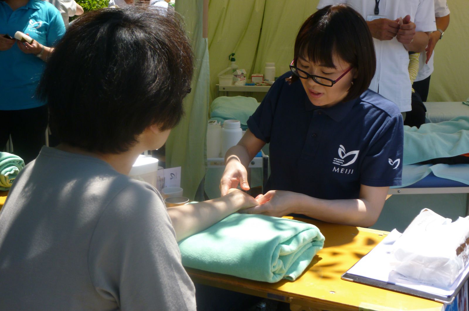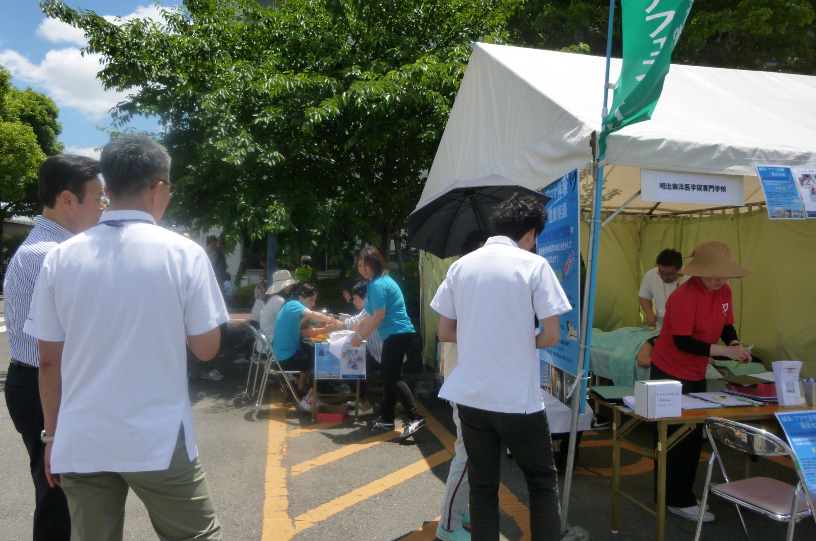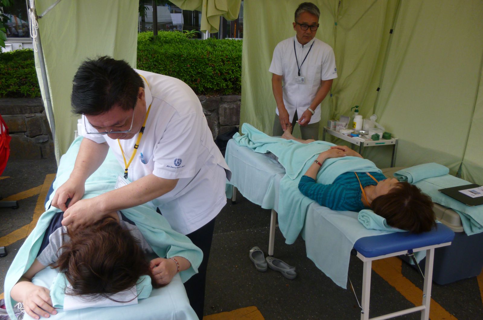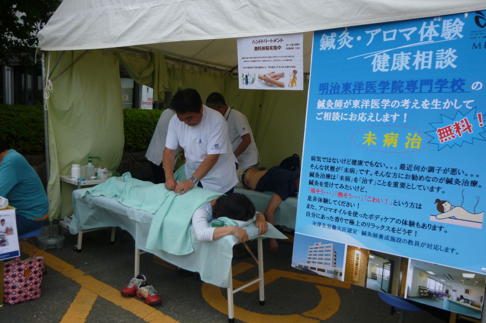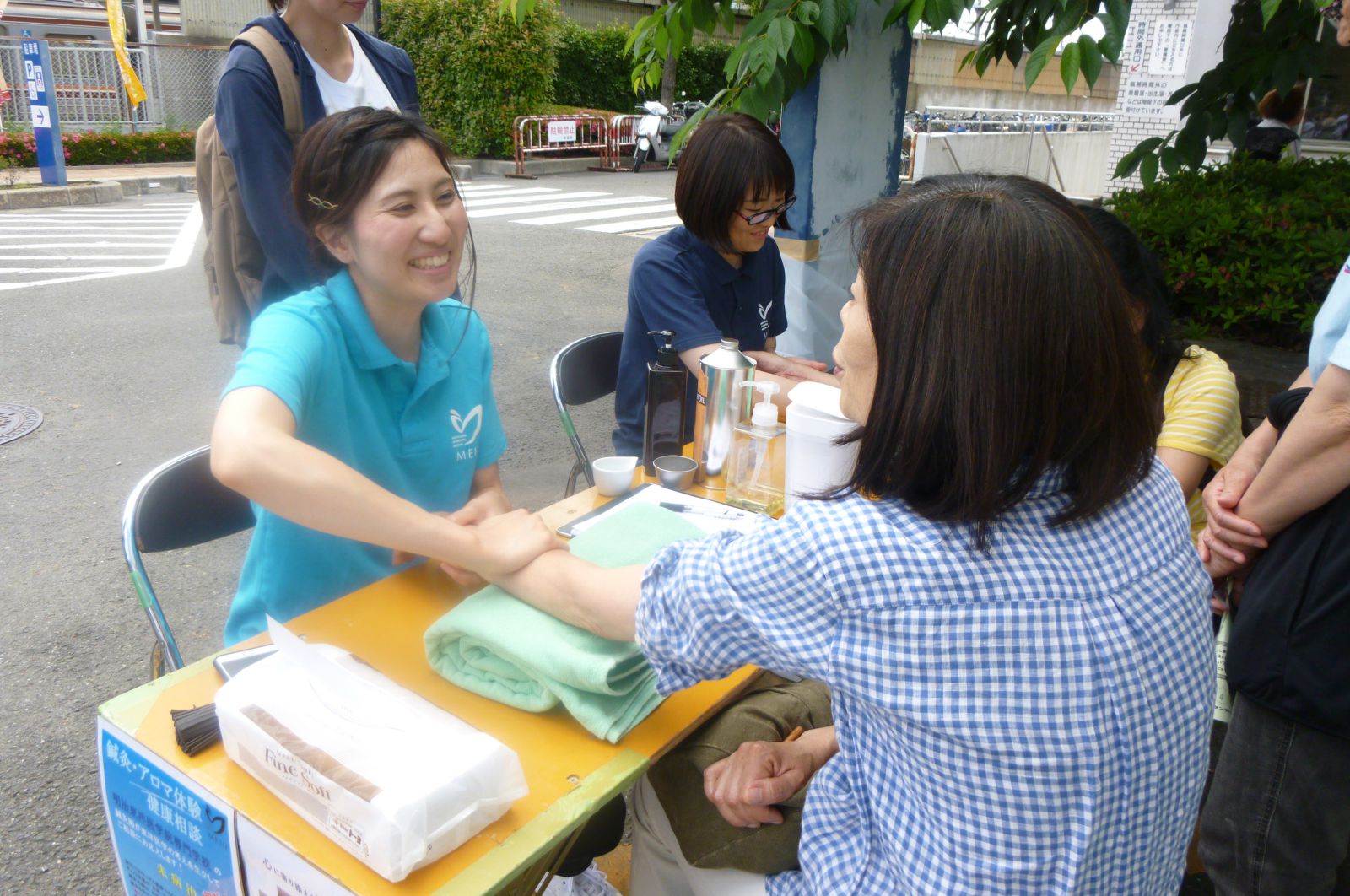 本校は『鍼灸体験・アロマ体験・健康相談』ブースとして出展させていただき、鍼灸学科の教員が東洋医学の考えを活かして健康や身体の不調などについてのご相談であったり、はり・きゅうによる治療をみなさまに体験していただきました。さらに今年は、アロマを使用したハンドトリートメントも体験していただける内容でした。