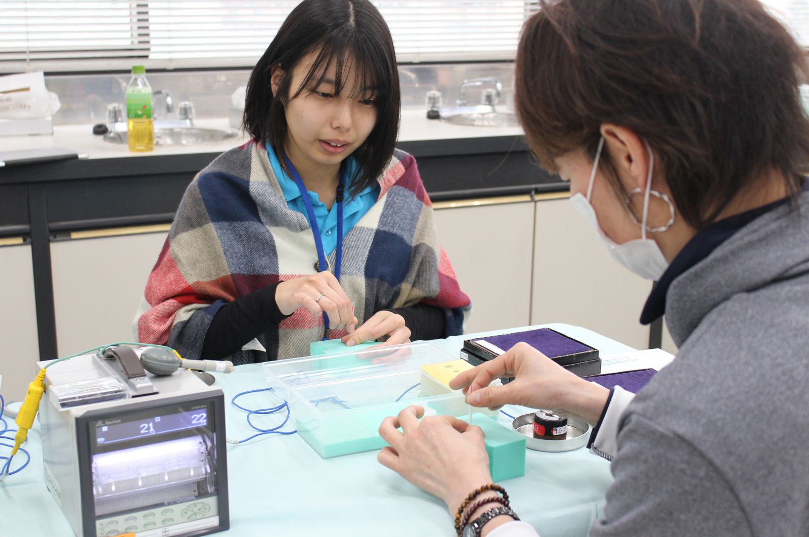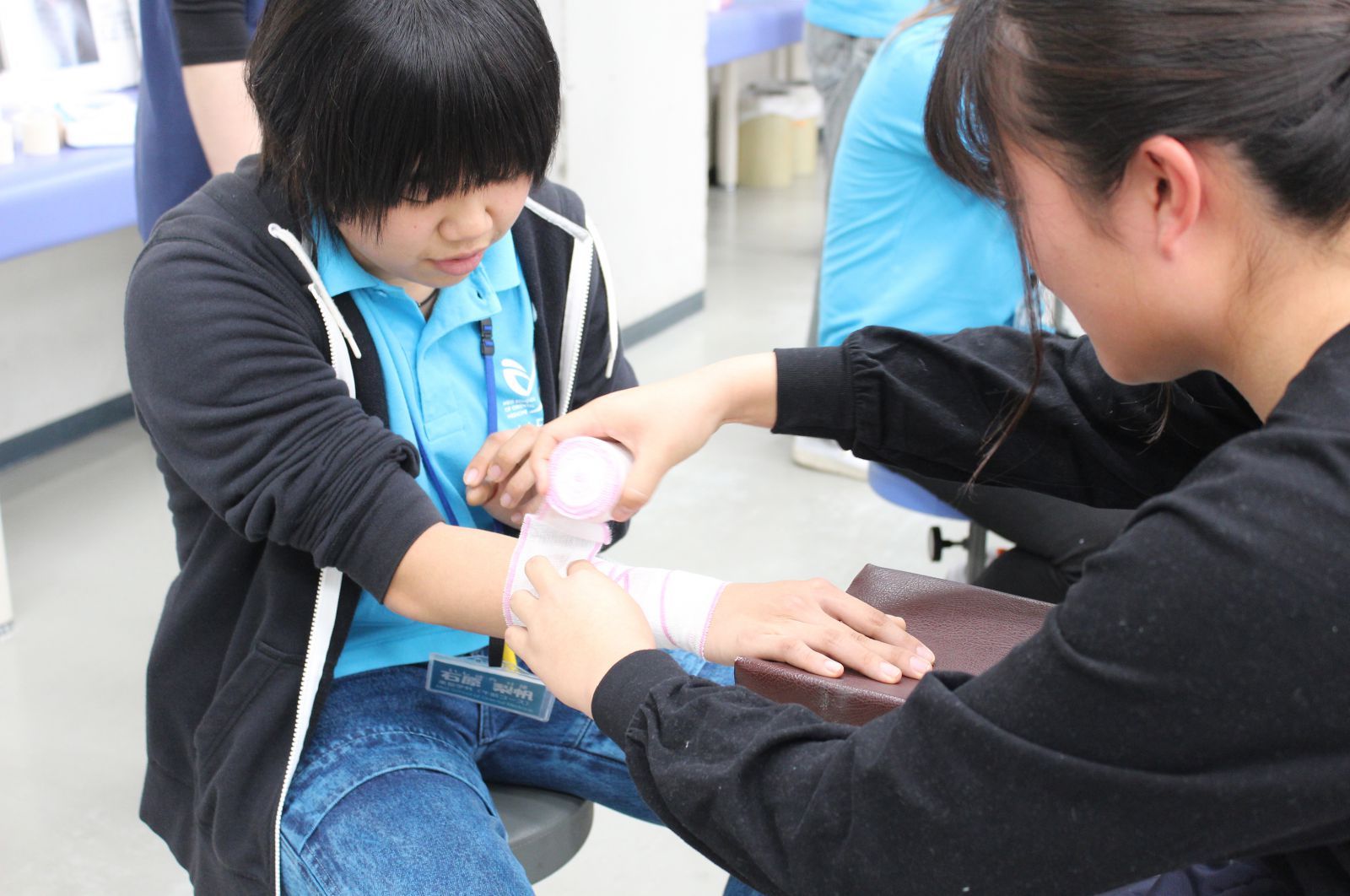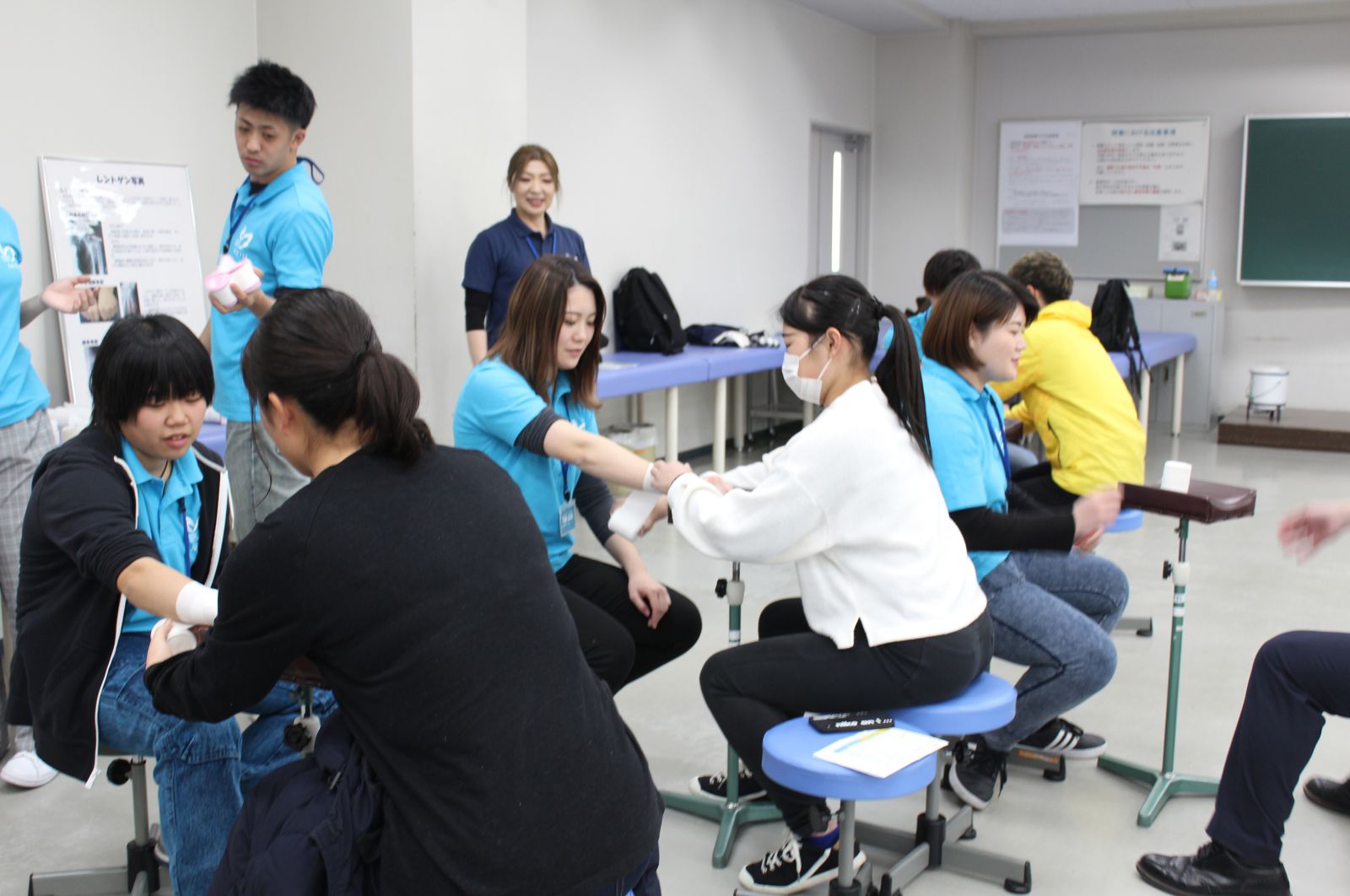 そして、午後からのオープンキャンパスの参加者の皆様は、本校の特色や鍼灸学科・柔整学科でのカリキュラムについて知っていただく学校紹介・学科紹介、鍼やお灸・包帯などの基礎技術を体験学習に参加いただきました。