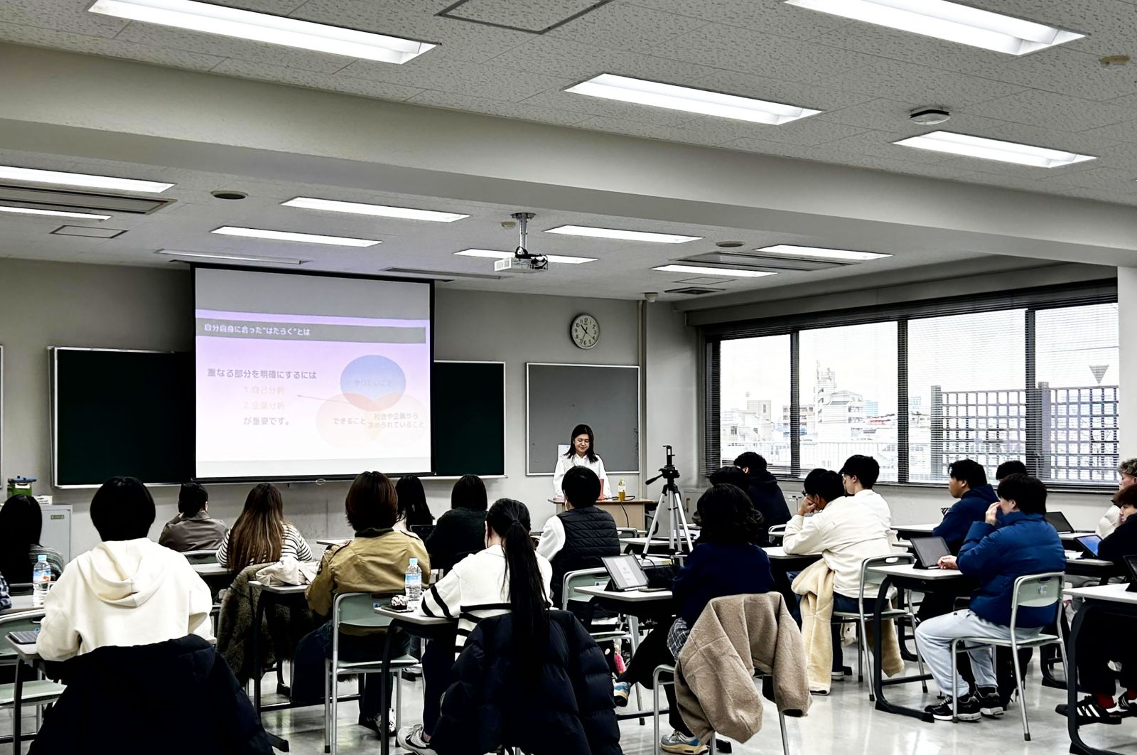 午前中は、本校で導入している就活アプリ『キャリアマップ』の活用について、キャリアマップの担当者様より紹介いただき、履歴書の作成の仕方や就活においてのポイントや注意点などをお話しいただきました。